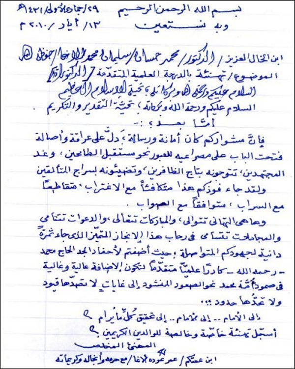 تهنئة من الأستاذ عمر عودة(ابن عمة د. محمد حسان)