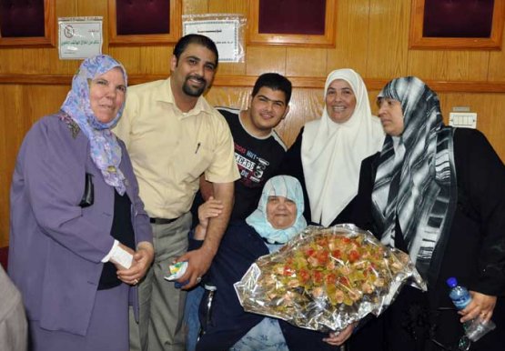 تظهر الحاجه ام شاكر والدة م.احمد تحمل باقة ورود وخلفها بناتها واحفادها