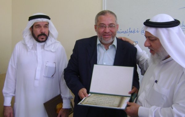 يسلم الإجازة للأستاذ أسامة وبجانبهما الشيخ أحمد فاضل غندور