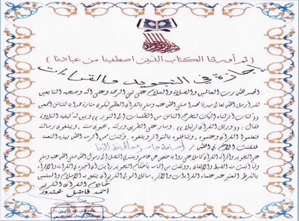 أكرمه الله بهذه النعمة فلقنت الأخ في الله : أسامة جاسر عبد الحافظ الأغا علم التجويد ، واقرأته القرآن كاملا على رواية حفص عن عاصم ، وبسندي المتصل إلى رسول الله – صلى الله عليه وسلم - ،ولما آنست منه الضبط والإتقان، ووثقت من إلمامه بأحكام