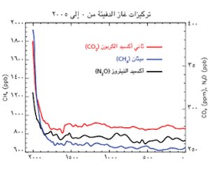 ازدياد تركيز غازات الدفيئة في الغلاف الجوي للأرض بعد الثورة الصناعية. المصدر: تغير المناخ، يونيب، 2007