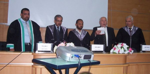 يوم الاثنين الموافق 14/05/2007 د. حمدي زعرب- مشرفا ورئيسا، أ. د. يوسف عاشور- مناقشا داخليا د. ماهر درغام- مناقشا داخليا