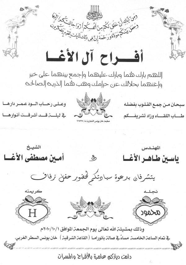 الرئيسة/زفاف/دعوة لحضور حفل زفاف أ. محمود ياسين الأغا زفاف دعوة لحضور حفل زفاف أ. محمود ياسين الأغا تاريخ النشر : الأربعاء | 29-09-2010 | 12:24 14959 سهرة الشباب بعد صلاة عشاء يوم غد الخميس مقابل ديوان العائلة بالقلعة اضغط هنا للتواصل أو التعرف على أ. محمود ياسين طاهر حافظ عثمان الأغا يمكنك تلقي أحدث الأخبار أول بأول بانضمامك لإحدى مجموعات الواتساب الخاصة بالعائلة من خلال الضغط هنـا اظهر المزيد