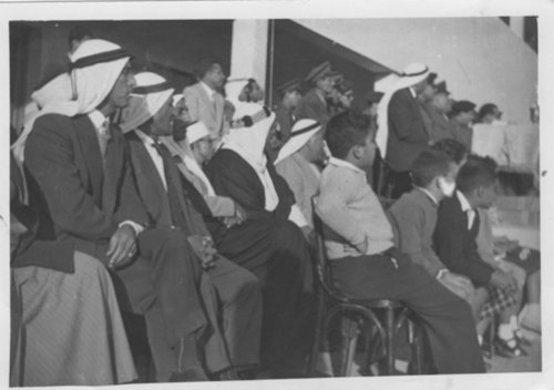 صورة جانبية غير دقيقة الملامح التقطت أثناء حفل رياضي أقيم بمدرسة خان يونس الثانوية في العام 1959 ويبدو إلى الشمال والدنا المرحوم خالد نعمان الأغا يجّب سيجارة وإلى جانبه المرحوم أبوعلي فارس، وإلى جانبه المرحوم الحاج عليان المصري، ثم المرحوم طاهر يوسف الأغا يرحمهم الله جميعاً.