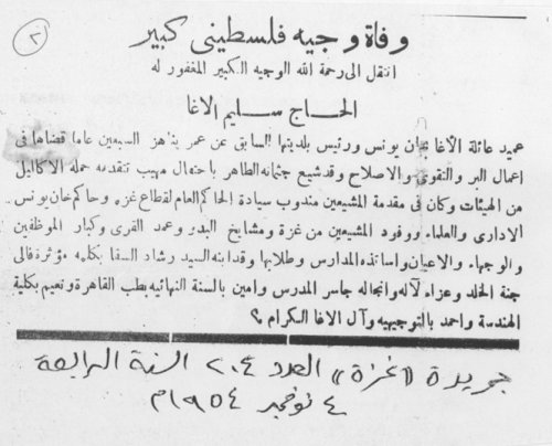 وفاة الحاج سليم الأغا جريدة "غزة" بتاريخ 4/11/1954م وفاة وجيه فلسطيني كبير انتقل إلى رحمة الله الوجيه الكبير المغفور له الحاج سليم الأغا عميد عائلة الأغا بخان يونس ورئيس بلديتها السابق عن عمر يناهز السبعين عاماً قضاها في أعمال البر والتقوي والإصلاح وقد شيع جثمانه الطاهر باحتفال مهيب تتقدمه حملة الاكاليل من الهيئات وكان في مقدمة المشيعين مندوب سيادة الحاكم العام لقطاع غزة وحاكم خان يونس الإداري والعلماء ووفود المشيعين من غزة ومشايخ البدو وعمد القرى وكبار الموظفين والوجهاء والاعيان واساتذة المدارس وطلابها وقد ابنه السيد رشاد السقا بكلمة مؤثرة، فإلى جنة الخلد وعزاء لآله وانجاله جاسر المدرس وأمين بالسنة النهائية بطب القاهرة ونعيم بكلية الهندسة وأحمد بالتوجيهية وآل الأغا الكرام.