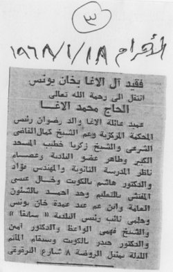 خبر وفاة الحاج محمد حمدان الأغا جريدة الأهرام 18/1/1968م فقيد آل الأغا بخان يونس انتقل إلى رحمة الله تعالى الحاج محمد الأغا عميد عائلة الأغا والد رضوان رئيس المحكمة المركزية وعم الشيخ كمال القاضي الشرعي والشيخ زكريا خطيب المسجد الكبير وطاهرعضو البلدية وعصام ناظر المدرسة الثانوية والمهندس فؤاد والدكتور هاشم بالكويت وخال عيسى المفتش بالتعليم وجد أحمد بالشؤون العامة وابن عم عيد عمدة خان يونس وحلمي نائب رئيس البلدية "سابقا" والشيخ فهمي الواعظ والدكتور أمين والدكتور حيدر بالكويت وسيقام المأتم الليلة بمنيل الروضة 8 شارع البرقوقي.