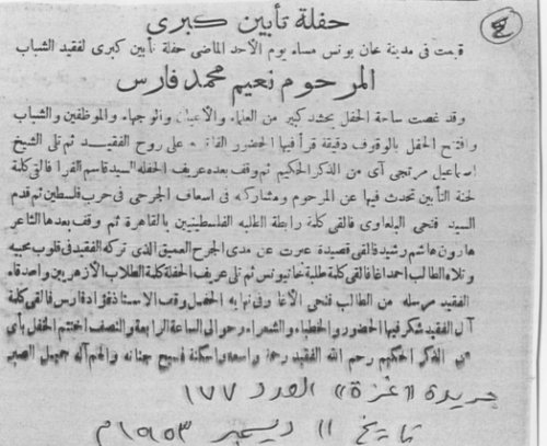 حفل تأبين المرحوم نعيم محمد فارس جريدة "غزة" بتاريخ 11/12/1953م