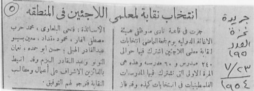 انتخاب نقابة معلمي اللاجئين في المنطقة جريد غزة العدد ??? - 23/5/1954م انتخاب نقابة لمعلمي اللاجئين في المنطقة جرت في قاعة نادي موظفي هيئة الاغاثة الدولية يوم الجمعة الماضي انتخابات لنقابة معلمي اللاجئين اشترك فيها حوالي ??? مدرس و60 مدرسة وهذه هي المرة الأولى التي تشترك فيها المدرسات الفلسطينيات في انتخابات كهذه وقد فاز الأساتذة: فتحي البلعاوي، محمد حرب، مصطفي الفار، محمود مقداد، معين بسيسو، عبدالقادر الهبلي، حسن أبو حمده، نعمان النونو وعبدالقادر البزم وقد انيط بالفائزين الأشراف على أعمال ومطالب النقابة فنرجو لهم التوفيق.