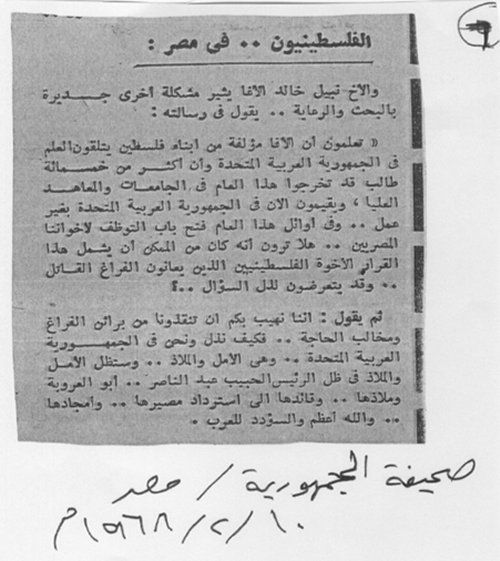 الفلسطينيون.. في مصر جريدة الجمهورية المصرية بتاريخ 10/2/1968م الفلسطينيون.. في مصر: والأخ نبيل خالد الأغا يثير مشكلة أخرى جديرة بالبحث والرعاية.. يقول في رسالته: "تعلمون أن آلافا مؤلفة من أبناء فلسطين يتلقون العلم في الجمهورية العربية المتحدة، وأن أكثر من خمسمائة طالب قد تخرجوا هذا العام في الجامعات والمعاهد العليا، ويقيمون الآن في الجمهورية العربية المتحدة بغير عمل.. وفي أوائل هذا العام فتح باب التوظف لاخواننا المصريين.. هلا ترون انه كان من الممكن أن يشمل هذا القرار الأخوة الفلسطينيين الذين يعانون الفراغ القاتل.. وقد يتعرضون لذل السؤال..؟ ثم يقول: إننا نهيب بكم ان تنقذونا من براثن الفراغ ومخالب الحاجة.. فكيف نذل ونحن في الجمهورية العربية المتحدة.. وهي الأمل والملاذ.. وستظل الأمل والملاذ في ظل الرئيس الحبيب عبدالناصر.. أبوالعروبة وملاذها.. وقائدها إلى استرداد مصيرها.. وأمجادها.. والله أعظم والسؤدد للعرب.
