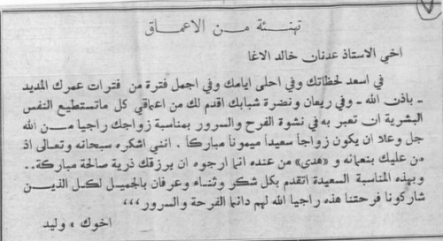 تهنئة من الأعماق جريدة "أخبار دبي"25/7/1968م تهنئة من الأعمال أخي الأستاذ عدنان خالد الأغا في أسعد لحظاتك وفي أحلى أيامك وفي أجمل فترة من فترات عمرك المديد - باذن الله - وفي ريعان ونضرة شبابك أقدم لك من أعماقي كل ما تستطيع النفس البشرية أن تعبر به في نشوة الفرح والسرور بمناسبة زواجك راجياً من الله جل وعلا أن يكون زواجاً سعيداً ميموناً مباركاً، انني اشكره سبحانه وتعالى إذ منَّ عليك بنعمائه و"هدى" من عنده انما أرجوه أن يرزقك ذرية صالحة مباركة وبهذه المناسبة السعيدة اتقدم بكل شكر وثناء وعرفان الجميل لكل الذين شاركونا فرحتنا هذه راجياً الله لهم دائماً الفرحة والسرور. أخوك، وليد