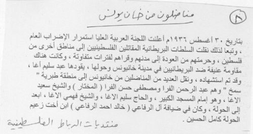 مناضلون من خان يونس منتديات الرباط الفلسطينية 2008م مناضلون من خان يونس بتاريخ 30 أغسطس 1936م أعلنت اللجنة العربية العليا استمرار الإضراب العام، وتبعا لذلك نقلت السلطات البريطانية المقاتلين الفلسطينيين إلى مناطق أخرى من فلسطين، وحرمتهم من العودة إلى مدنهم وقراهم لفترات متفاوتة، وكانت هناك مقاومة عنيفة ضد البريطانيين في مدينة خان يونس وحولها، يقودها عبد سليم أغا، وقد تم استشهاده، ونقل العديد من المناضلين من خان يونس إلى منطقة طبرية "سمخ" وهم عبدالرحمن الفرا ومصطفى حسن الفرا "المختار" والشيخ سعيد الأغا، وهو إمام المسجد الكبير، والحاج سليم الأغا، والشيخ فهمي الأغا، أبعد إلى الحولة، وكان في ضيافة آل الرفاعي "خالد أحمد الرفاعي" ابن أخت زعيم الحولة كامل الحسين.