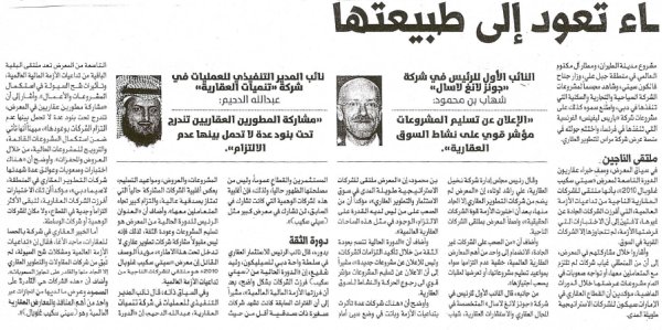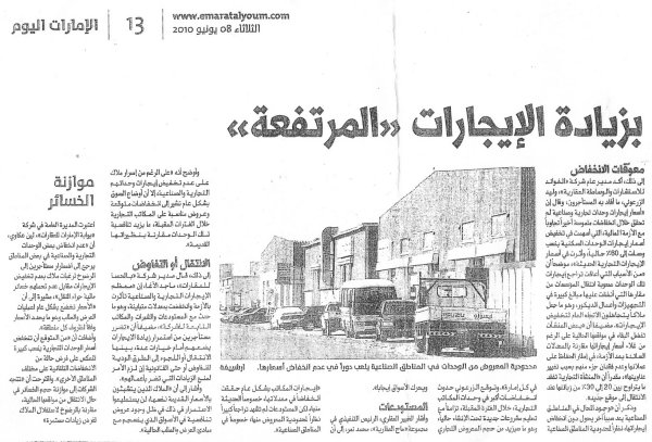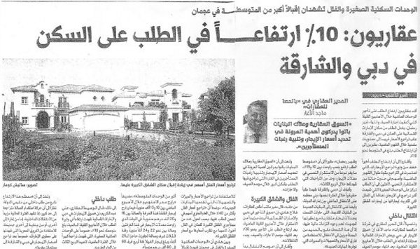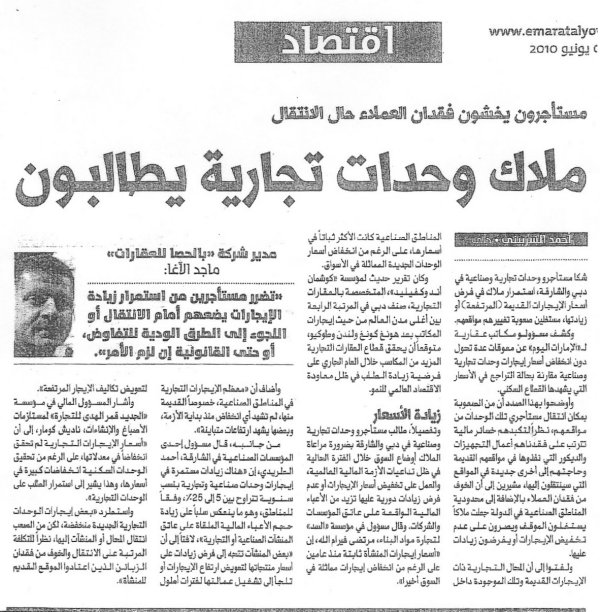 قامت صحيفة الأمارات اليوم بعمل تحقيق ولقاء خاص بالشأن العقارى فى دبى والأمارات الشمالية .وكان لرأى ا.ماجد الأغا مدير عقارات بالحصا والخبير المعتمد من دائرة الأراضى والأملاك فى دبى فى المرونة بعدم زيادة الايجارات وتخفيضها الأثر الجيد بين المستأجرين فى السوق العقارى فى دبى .