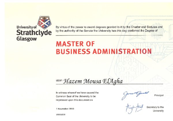غلاسكو- بريطانيا- 1-11-2010 حصل م. حازم موسى الاغا على شهادة الماجستير MBA بتقديرعام جيد جدا من جامعة Strathclyde وقد كانت اطروحة الماجستير بعنوان :