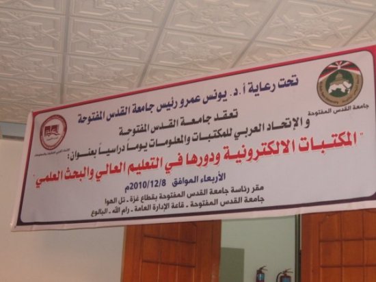 مقر رئاسة جامعة القدس المفتوحة بقطاع غزة – تل الهوا ، وقاعة الإدارة العامة برام الله عبر الفيديو كونفرنس تم عقد يوم دراسي يوم الأربعاء الموافق 8/12/2010 بعنوان "المكتبات الالكترونية ودورها في التعليم العالي والبحث العلمي" بالتعاون مع الاتحاد العربي للمكتبات والمعلومات ، وقد قام أ. محمد الأغا ود. إسماعيل صالح الفرا المشرف الأكاديمي بجامعة القدس المفتوحة بالمشاركة بورقة عمل حول "المكتبة الالكترونية ضرورة عصرية للتعليم الجامعي التقليدي والمفتوح" وذلك ضمن فعاليات اليوم الدراسي.