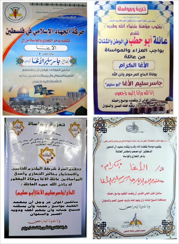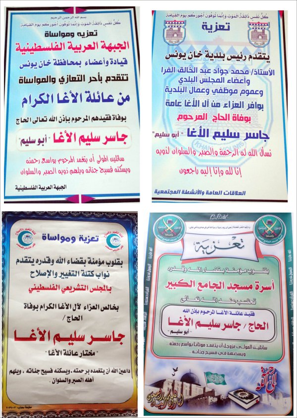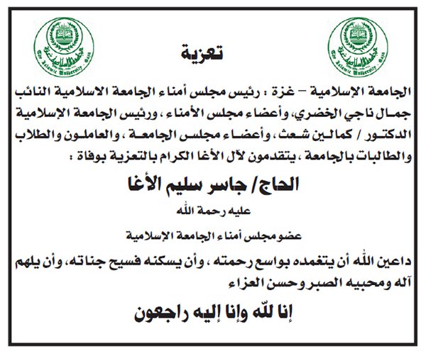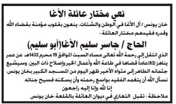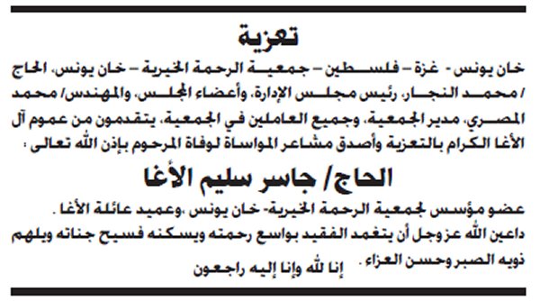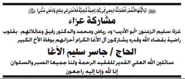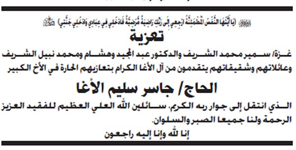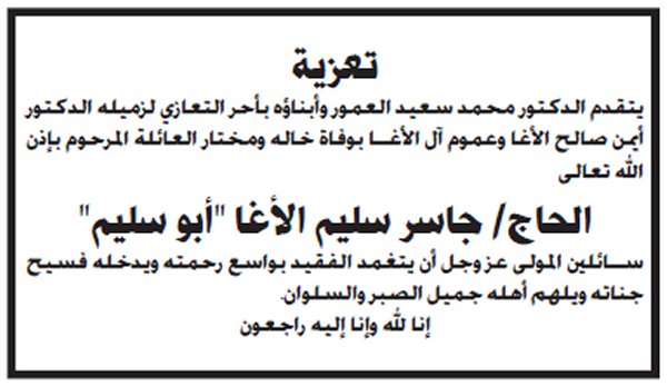 بسم الله الرحمن الرحيم (يَا أَيَّتُهَا النَّفْسُ الْمُطْمَئِنَّةُ ارْجِعِي إِلَى رَبِّكِ رَاضِيَةً مَرْضِيَّةً فَادْخُلِي فِي عِبَادِي وَادْخُلِي جَنَّتِي) شـــكر عــلي تــعــاز يتقدم الدكتور أمين سليم حسين الأغا مع عموم آل الأغا في الوطن والشتات بوافر الشكر وعظيم الامتنان، لكل من واساهم في فقيدهم وذلك بالمشاركة في تشييع الجنازة، أو حضور بيت العزاء أو بإرسال البرقيات وكتب التعازي أو الكتابة في الصحف و المجلات. كما نُثَمن مشاركة الذين تجشموا متاعب التنقل بما فيهم دولة رئيس الوزراء، والوزراء، والأجهزة والهيئات ، والمؤسسات والشركات، والجهات الخيرية، ورجال الإصلاح، وسائر المُحبين والمريدين. سائلين المولى عزً وجل ألا يريهم مكروهاً بعزيز |