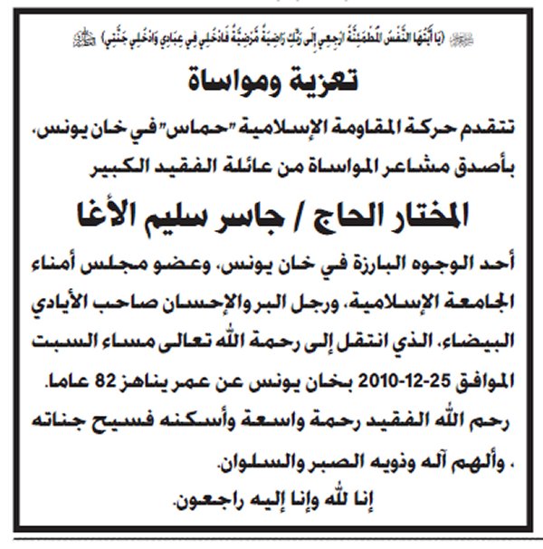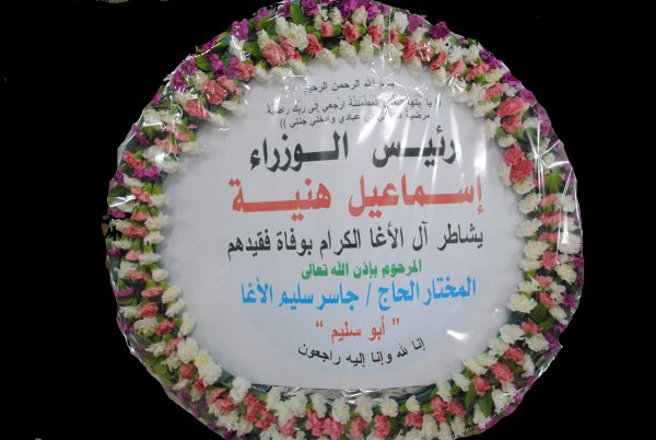 شكر على تعاز و اعلانات الصحف والاكاليل في وفاة المرحوم بإذن الله المختار الحاج جاسر سليم الأغا