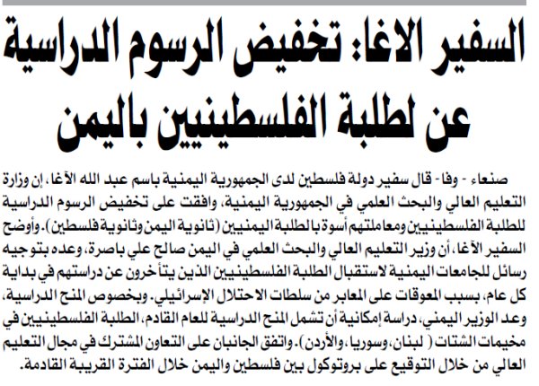 الرئيسة/متفرقات/السفير الأغا: تخفيض الرسوم الدراسية عن الطلبة الفلسطينيين باليمن متفرقات السفير الأغا: تخفيض الرسوم الدراسية عن الطلبة الفلسطينيين باليمن تاريخ النشر : الأحد | 16-01-2011 | 16:16 7537 اضغط هنا للتواصل أو التعرف على السفير باسم عبدالله يوسف حمدان الأغا يمكنك تلقي أحدث الأخبار أول بأول بانضمامك لإحدى مجموعات الواتساب الخاصة بالعائلة من خلال الضغط هنـا اظهر المزيد
