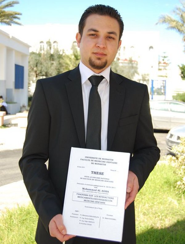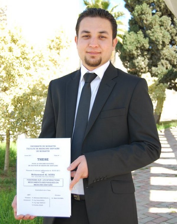 تونس-كلية طب الأسنان بالمنستر- الأربعاء- الموافق- 02-03-2011 تم بحمد الله وتوفيقه مناقشة رسالة ماجستير في طب الأسنـان للدكتور محمد عبدالمجيد قاسم محمد قاسم الأغا والتي كانت بعنوان"بانوراما عن تفاعلات الأدوية الخطيرة في طب الأسنان لدى مرضي القلب و السكر و الكلي و الكبد و المعده و زراعة الأعضاء وقد تم إعداد ومناقشة رسالة الماجستير باللغة الفرنسية، وبهذا يتقدم الوالد والوالدة والأخوات والأعمام والأخوال ، كما ويتقدم إبن العم سـعادة السفير الدكتور أنور الأغا وحرمه وعائلة الأغا الكريمة بأحر التهاني والتبريكات متمنين له مزيداً من التقدم والنجاح، وألف مبـــارك.