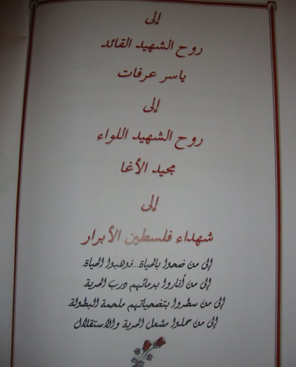 إهداء إلي روح الشهيد ياسر عرفات، وإلي الشهيد مجيد الأغا وجميع الشهداء