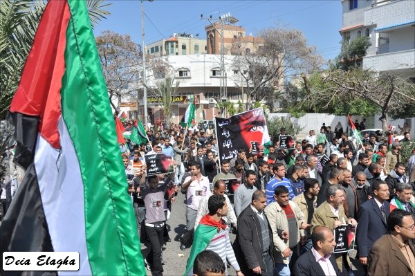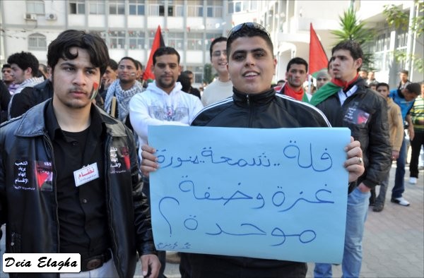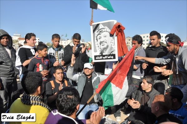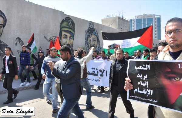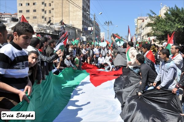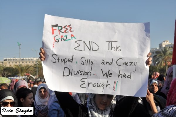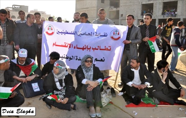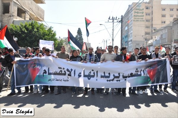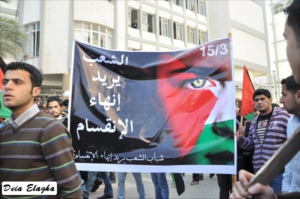 من الشباب، أطلقت على نفسها 'شباب فلسطين': إنهم انطلاقا من المصـلحة الوطنية نحو تعزيز الوحدة وإنهاء حالة الانقسـام، قمت مع أفراد المجموعة بعمل مجسمات للحالة الفلسطينية وكذلك إطلاق أغنية'. وأكد أن عملهم لن يقتصر على المشاركة في المسيرة فحسب، بل سيقومون بالاعتصام في الساحة انطلاقا من اليوم، وسيتواصـــل ذلك حتى تحقيق الهـدف المنشود. وأضاف أن هذا اليوم هو يــوم وطني، الذي يجب أن يكون نقطة انطلاق نحو مواصلة المساعي لإنهاء حالة الانقسام، وعليه يكفي انتهاك حقوق الإنسان، والعودة إلى حكومة الوحدة الوطنية. وأشار إلى أن استمرار حالة الانقسام، ستؤدي إلى استمرار انتهاك حقوق الإنسان، وتراجع الحياة الديمقراطية الفلسطينية.