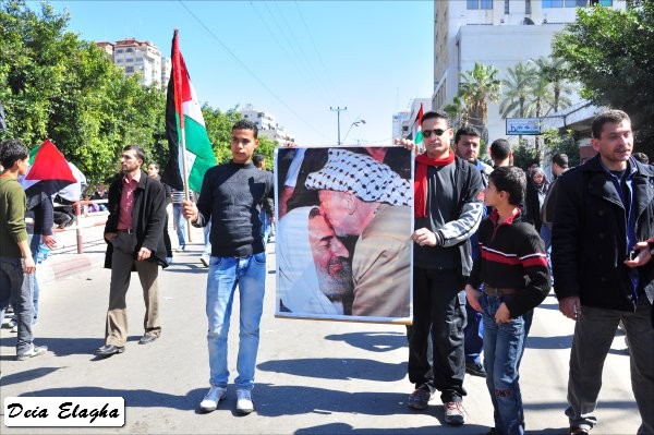 أثناء مرور المسيرة بجانب صورة للراحل الشهيد أبو عمار- مبنى السرايا الحكومي