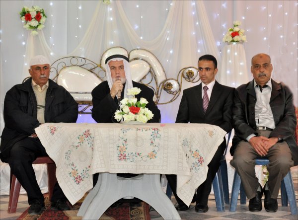 السادة: والد العروس، العريس، الشيخ مازن الأغا متحدثاً، والد العريس