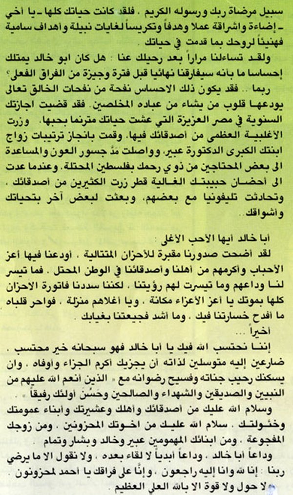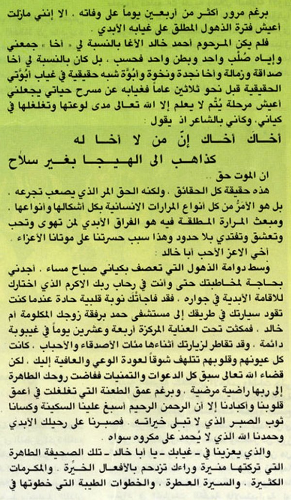 مقال باسم نبيل خالد الاغا كما نشر في مجلة أخبار الأسبوع القطرية بعد الوفاة.