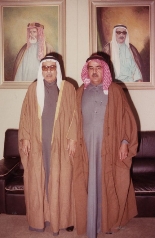 المرحوم احمد خالد الاغا " يميناً والى جواره المرحوم عبدالعزيز المساعيد عميد الصحافة الكويتية،والتقطت الصورة في مقر صحيفة الرأي العام بالكويت اثناء زيارة رسمية للكويت ضمن وفد قطري عالي المستوى