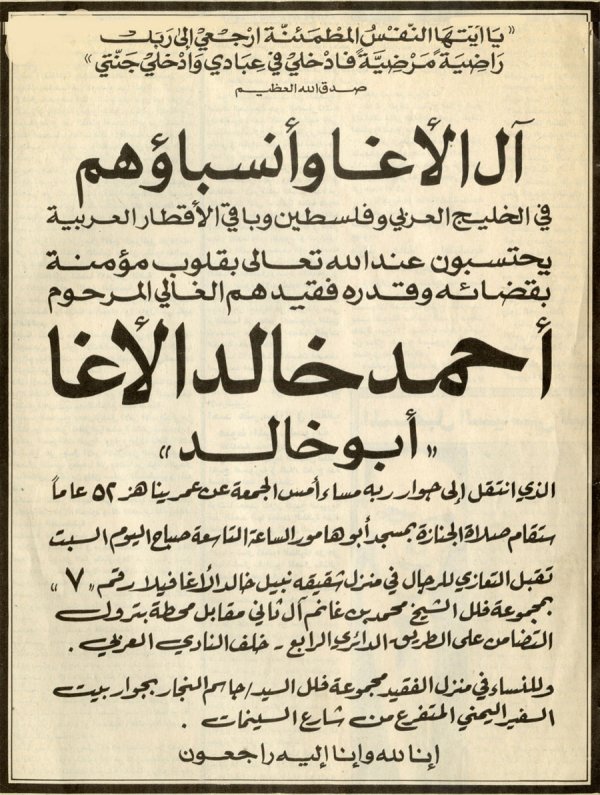 نعي المرحوم أحمد خالد الاغا كما نشر في الصحف القطرية 14/10/1989
