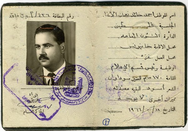 بطاقة عمله رئيساً لقسم الاعلام بدائرة الشؤون العامة بغزة 1966.