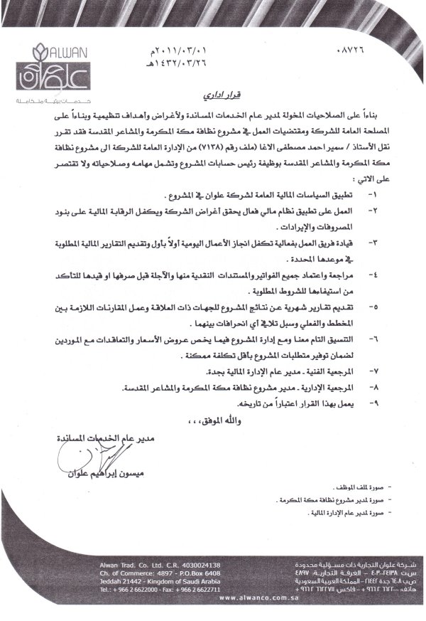 مكة المكرمة- تعيين الأستاذ سمير أحمد مصطفى الأغا مدير حسابات مشروع نظافة مكة المكرمة