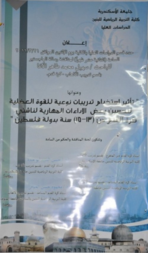 عنوان البحث كان نصه "تأثير استخدام تدريبات نوعية للقوة العضلية لتحسين بعض الأداءات المهارية لناشئي كرة القدم من (13 إلى 15) سنة بدولة فلسطين".
