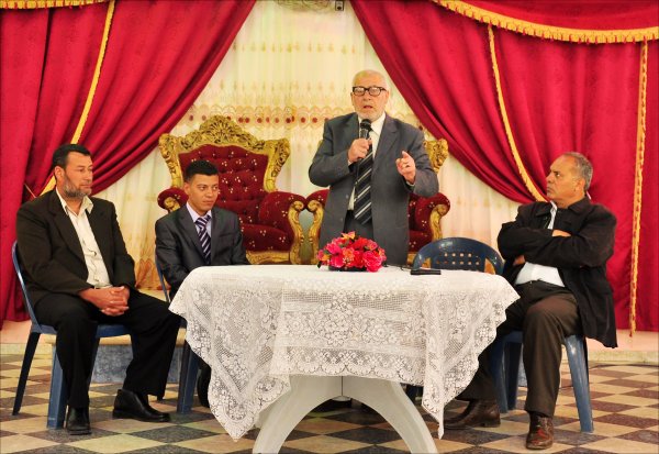 السادة: أ. أحمد نصر(خال العريس)، أ. عمر عودة الأغا متحدثاً، العريس، والد العروس