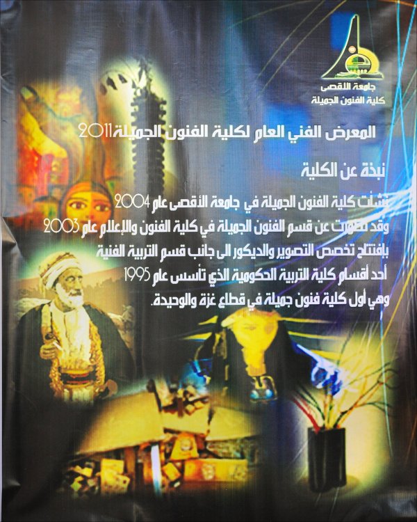 افتتح د. سلام زكريا الأغا رئيس جامعة الأقصى "المعرض الفني العام لكلية الفنون الجميلة 2011"، بمقر الجامعة في المواصي بمدينة خانيونس جنوب القطاع، وحضر المعرض عمداء الكليات والأكاديميين ولفيف من الطلبة، وألقى د. سلام كلمة الافتتاح ورحب فيها بالحضور وأكد على مواصلة الجهود من أجل النهوض والتقدم ومواكبة التطور المستمر.وضم المعرض أعمال فنية للطلبة من لوحات ورسومات وفنون جميلة، وفي النهاية شكر رئيس الجامعة جميع القائمين على المعرض لما بذلوه من جهود عظيمة واعداً بتقديم المساعدة والمساندة لهم من أجل الرقي والتقدم