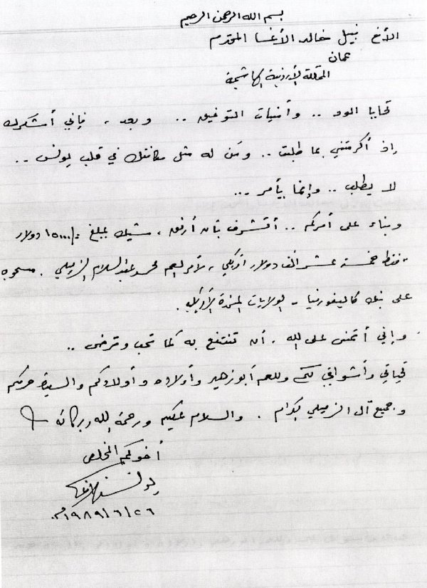 وبناء على أمركم . . أتشرف بأن أرفق ، شيك بمبلغ ١٥٠٠٠ دولار . . فقط خمسة عشر ألف دولار أميركي ، لأمر العم محمد عبدالسلام الزميلي . مسحوب على بنك كاليفورنيا - الولايات المتحدة الأميركية .