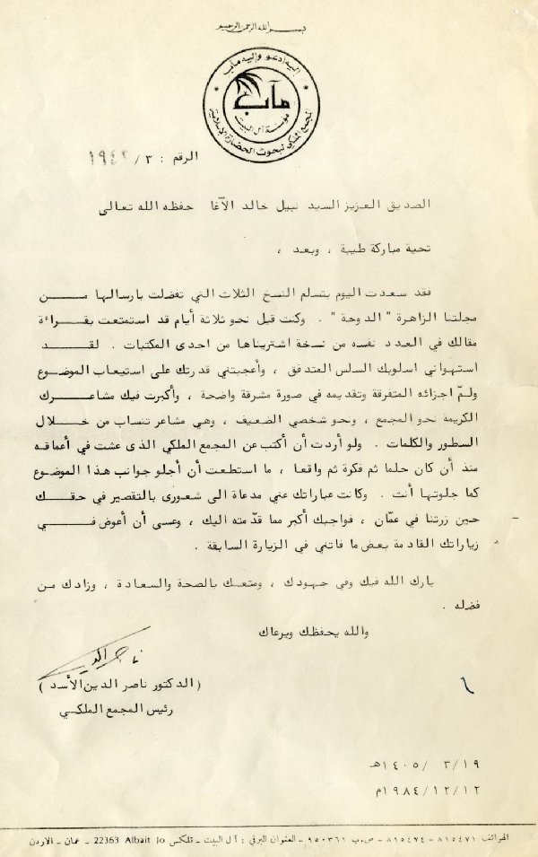 خلال فصل صيف العام ١٩٨٤ ، اعتمرت العاصمة الأردنية وتشرفت بزيارة استاذنا الكبير الدكتور ناصر الدين الأسد رئيس المجمع الملكي لبحوث الحضارة الإسلامية ، وأطلعني على نشاطات المجمع وأهدافه ومدى سعيه الحثيث لأداء رسالته الإسلامية السامية.