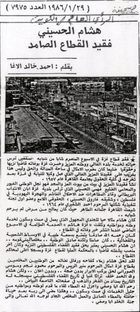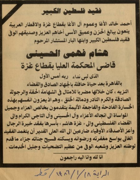 أحمد خالد الأغا وعموم آل الأغا بقطاع غزة والأقطار العربية ينعون ببالغ الحزن وعميق الأسى أخاهم العزيز وصديقهم الوفي فقيد فلسطين الكبير وابنها البار المستشار المرحوم هشام فهمي الحسيني قاضي المحكمة العليا بقطاع غزة الذي لبي نداء ربه أمس الأول بالقاهرة بعد حياة حافلة بالجهاد الصادق والقضاء النزيه ، كان خلالها مضرباً للأمثال في الشهامة الحقه والرجولة الصادقة والكرم النادر ودماثة الخلق ، وهم إذ يعزون أنفسهم بهذه الخسارة الفادحة والفاجعة الأليمة يتقدمون بخالص العزاء وجميل المواساة إلى أنجاله الأعزاء وآل الحسيني وآل التاجي الكرام ، وإلى القضاء الفلسطيني وإلى ( غزة هاشم ) بأسرها بفقد خيرة الرجال وأعز الأصدقاء الأوفياء ضارعين إلى الله العلي القدير أن يتغمد الفقيد الغالي بواسع مغفرته ورضوانه ويسكنه فسيح جناته جزاء ما قدم لوطنه العزيز وشعبه الوفي من عظيم التضحيات وجليل الخدمات - إنا لله وإنا إليه راجعون .