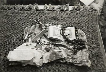 بعض المتعلقات الشخصية للشهيد عبدالقادر الحسيني التي تم تصويرها اثر مواراة جثمانه الطاهر إلى جوار والده الزعيم الشهيد موسى كاظم باشا الحسيني بالقدس.