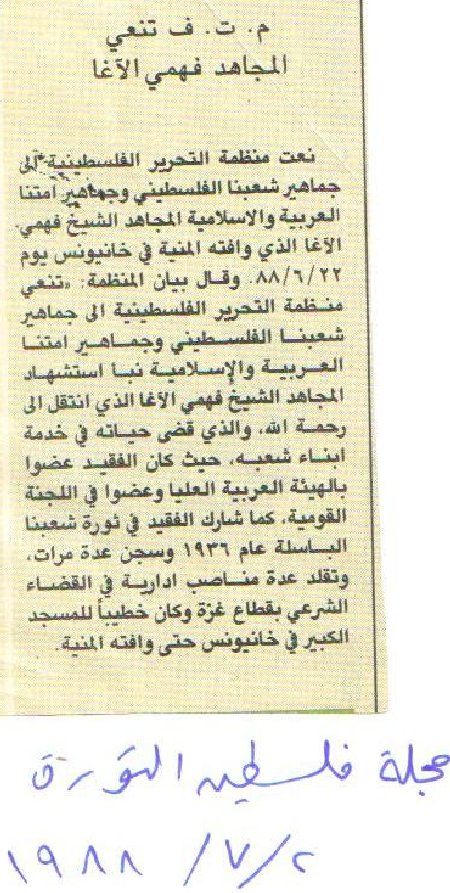 نعت منظمة التحرير الفلسطينية إلى جماهير شعبنا الفلسطيني وجماهير أمتنا العربية والإسلامية المجاهد الشيخ فهمي الأغا الذي وافته المنية في خان يونس يوم ٢٢/٦/١٩٨٨م.