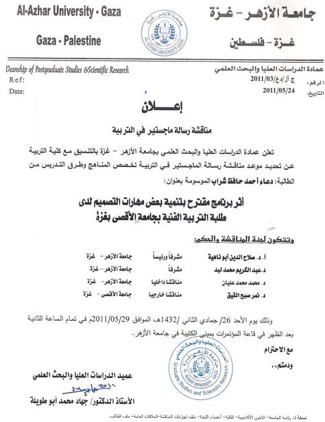 يتشرف الدكتور- خليل مروان خليل الاغا بدعوة سيادتكم لحضور مناقشة رسالة ماجستير حرمه الباحثة دعاء احمد شراب في جامعة الازهر غزة - قاعة المؤتمرات -مبنى الكتيبة وذلك يوم الاحد الموافق 29-5-2011 الساعة الثانية بعد الظهر