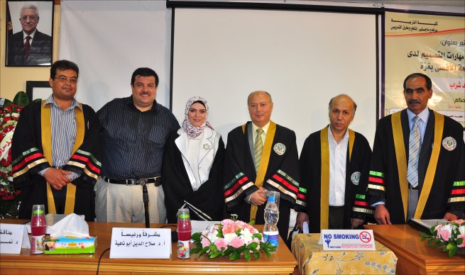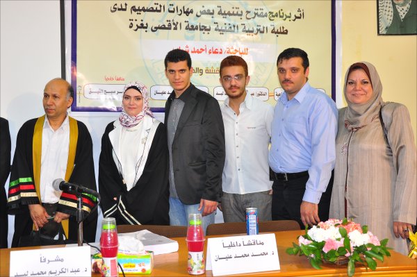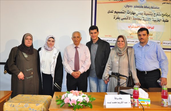 السادة: د. محمد عليان، أ. أحمد الفرا، والد الباحثة، د. عبدالكريم لبد، أ. د. صلاح الدين أبوناهية،
