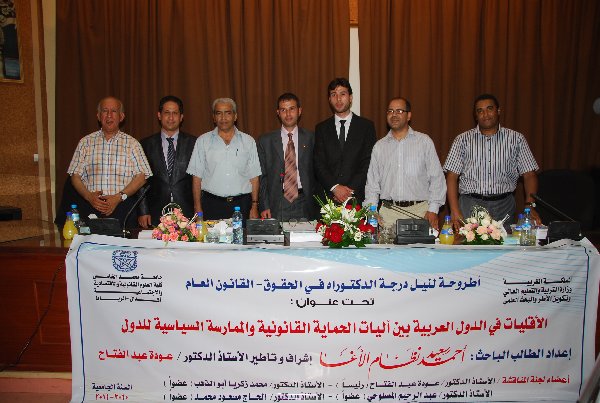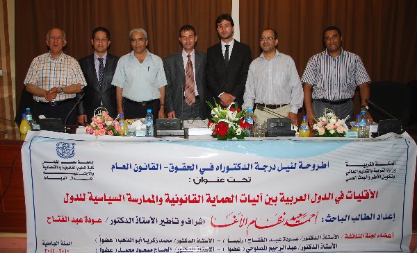 حصول السيد "أحمد سعيد" نظام سعيد الأغا علي درجة الدكتوراة في الحقوق تخصص علاقات دولية بتقدير عام مشرف جداً (إمتياز) من كلية الحقوق بجامعة محمد الخامس بالرباط وذلك مساء الإثنين الموافق 13/6/2011وجاءت أطروحة الدكتوراة تحت عنوان (الأقليات في الدول العربية بين أليات الحماية القانونية والممارسة السياسية للدول). وقد أشرف علي المناقشة لجنة علمية مكونة من الأستاذ الدكتور عودة عبدالفتاح أستاذ التعليم العالي بكلية الحقوق بجامعة الحسن الثاني/ الدار البيضاء، مشرفاً ورئيساً ،وعضوية كل من