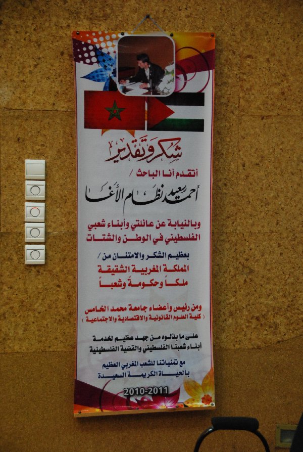 لجنة المناقشة والاخوين إيهاب وأحمد بجوار لوحة شكر وتقدير للمغرب ملكا حكومة وشعبا