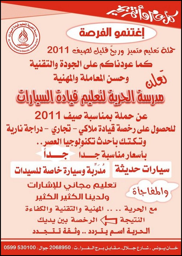تعلن مدرسة الحرية لتعليم قيادة المركبات عن مفاجأت حملة صيف 2011