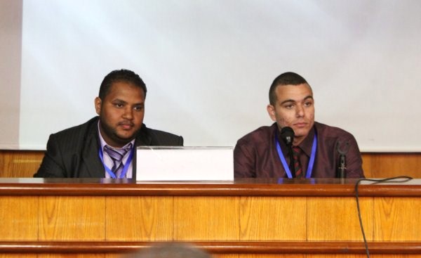 الخريج وزميله جواد ابو عليان اثناء الاجابة على اسئلة المناقشة