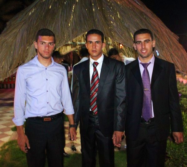 محمد صافي وأحمد الميناوي ومحمد شبير أزواج شقيقات العروس يتوسطهم العريس