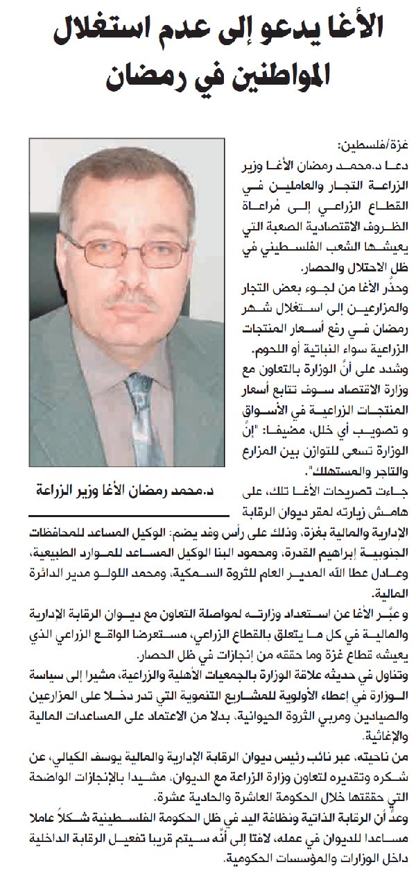 الرئيسة/متفرقات/وزير الزراعة يدعو إلى عدم إستغلال المواطنين في رمضان متفرقات وزير الزراعة يدعو إلى عدم إستغلال المواطنين في رمضان تاريخ النشر : الثلاثاء | 26-07-2011 | 20:43 7030 اضغط هنا للتواصل أو التعرف على الوزير محمد رمضان محمد حمدان الأغا يمكنك تلقي أحدث الأخبار أول بأول بانضمامك لإحدى مجموعات الواتساب الخاصة بالعائلة من خلال الضغط هنـا اظهر المزيد