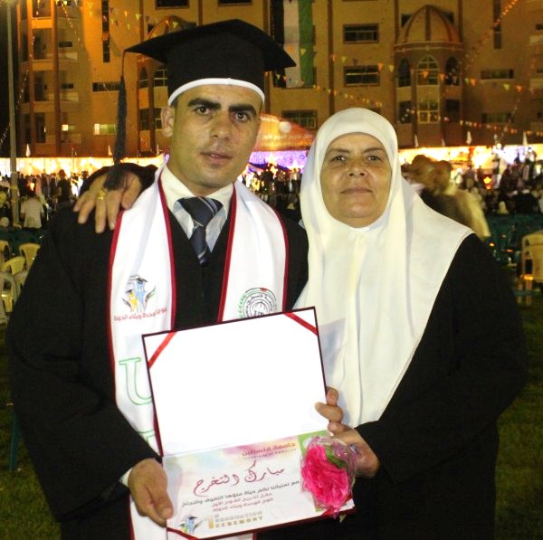 الخريج مع والدته الحاجة أمنة صالح الأغا