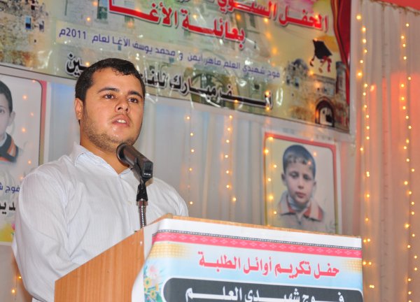 صالة السعادة- طريق رفح الغربية- خان يـونس السبت الموافق 30-07-2011 ، قــامت عــائلة الأغا -كعادتها كل عام- بتكريم أبنائها المتفوقين من طلاب المراحل التعليمية المختلفة والذي كان هذا العام تكريماً لروح شهيدي العلم "ماهر أيمن الأغا ومحمد يوسف الأغا". بدأ برنامج الحفل بتلاوة آيات عطرة من الذكر الحكيم تلاها علي مسامعنا الطالب بلال منهل الأغا، ورحب عريف الحفل الأخ نايف محمد الأغا بـالحاضـرين، ثم ألقي الدكتور مروان سليم الأغا كلمة العــائلة، ثم ألقت الطـالبة فداء نــافذ الأغا كلمة المتفوقين، وفقرة فنية شعريـة ألقالها الشاعر مصطفى عثمان الأغا، ثم بعد ذلك تم تكريم الخريجين من حمـلة الدكتوراه والماجستير والبكالوريوس والدبلوم، ثم تلا ذلك توزيع جائزة المرحوم الأستاذ عصام سعيد الأغا لطلاب الثانوية العامة.