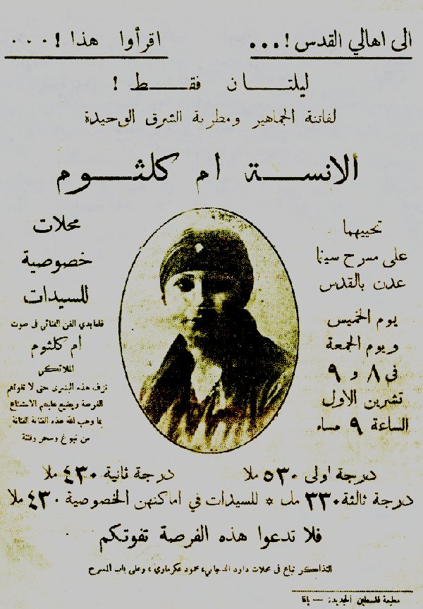 أمام القراء الفضلاء صورة لإعلان قديم لحفلة ستقيمها «فاتنة الجماهير ومطربة الشرق الوحيدة» الآنسة أم كلثوم في القدس خلال عقد الثلاثينيات من القرن العشرين أيام كانت فلسطين خاضعة للإحتلال البريطاني «1920-1948»، أي ان عمر الإعلان يزيد عن ثمانين عاماً. والإعلان مطبوع بمطبعة «فلسطين الجديدة» بيافا، ومصبوغ بصبغة دعائية بحتة ومسهبة ورد فيها حرفياً: إلى أهالي القدس.. اقرأوا هذا!!!، ليلتان فقط! لفاتنة الجماهير ومطربة الشرق الوحيدة الآنسة أم كلثوم تحييهما على مسرح سينما عدن بالقدس يوم الخميس ويوم الجمعة في ٨ و٩ تشرين الأول الساعة ٩ مساء، محلات خصوصية للسيدات، يتبدى الفن الغنائي في صوت أم كلثوم الملائكي، نزف هذه البشرى حتى لا تفوتهم الفرصة ويضيع عليهم الاستمتاع بما وهب الله هذه الفنانة الفتانة من نبوغ وسحر وفتنة. درجة أولى ٥٣٠ ملا (مليما)، درجة ثانية ٤٣٠ ملا، درجة ثالثة ٣٣٠ مل، للسيدات في أماكنهن الخصوصية ٤٣٠ ملا، فلا تدعوا هذه الفرصة تفوتكم، التذاكر تباع في محلات داود الدجاني، محمود عكرماوي، وعلى باب المسرح (مسرح سينما أديسون).انتهى نص الإعلان.